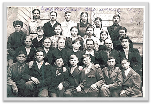 А когда фронтовик чуть поправился, он сказал моему прадедушке: «Сынок, тебе надо учиться, ты три года не ходишь в школу». И мой прадедушка 1 октября 1944 года, в 14 лет пошел в 5 класс Ефимовский семилетней школы. Учиться было нелегко, но дети стремились к знаниям, понимали, что стране нужны образованные люди. Слушаю ветерана: «Школа располагалась в нескольких старых домах. Печь топили кизяком, но все равно было холодно. Сидели в теплой одежде. Формы не было. Для книг шили торбу. Писали карандашом, перьевыми ручками. Чернила в чернильницах часто замерзали, приходилось отогревать дыханием Тетради выдавали только для контрольных, они хранились в школе. Дома писали на газетах, книгах, между печатных строк. Я использовал оставшиеся от отца толстые учебники». На фото 1947 года изображены учащиеся 7 класса, среди них - мой прадедушка.