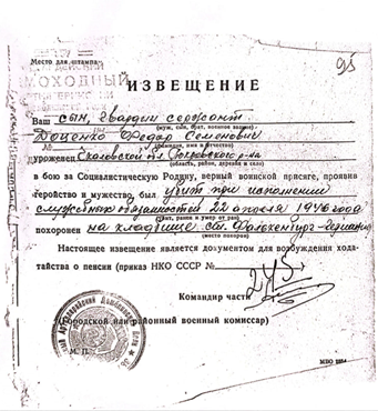 «Ваш сын, гвардии сержант Доценко Фёдор Семёнович, уроженец Чкаловской обл Покровского р-на.