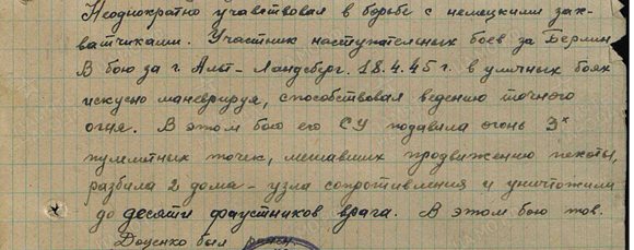 В 1945 году он был представлен к ордену Отечественной войны II степени за участие в наступательных боях за Берлин.