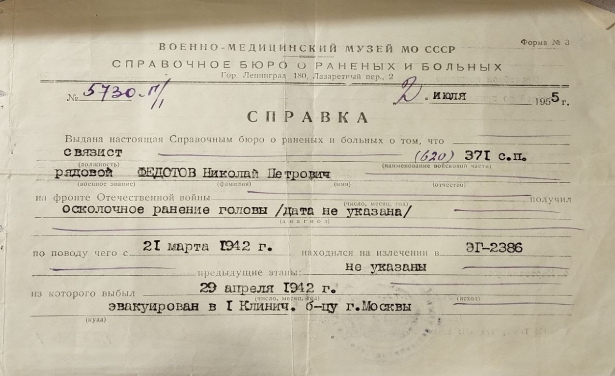 В марте 1942 г. прадед получил серьезное осколочное ранение головы, что подтверждено справкой.