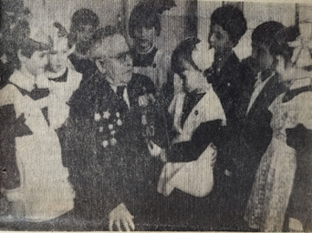 Ветеран Великой Отечественной войны Федотов Н.П. с учащимися 1Б класса школы № 6 г. Гай, «Урок мужества», 1986 г. | Вырезка статьи «Урок мужества» из газеты «Гайская новь», 1986 г. |
