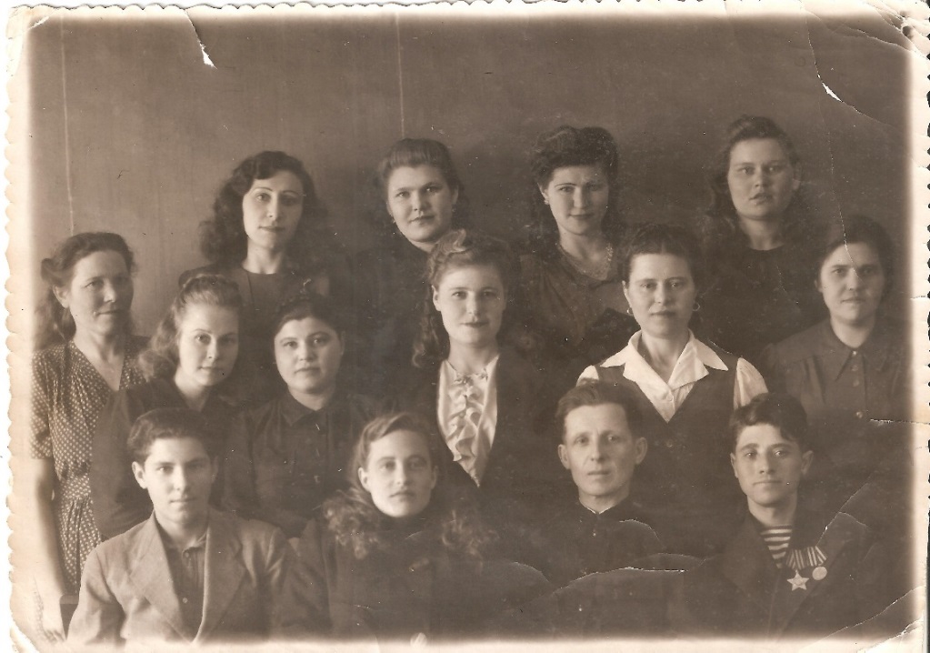 Федор Михайлович Попов (с орденами) c работниками швейной фабрики № 2 (Сталинская фабрика). 1946 г. Город Чкалов (ныне Оренбург).