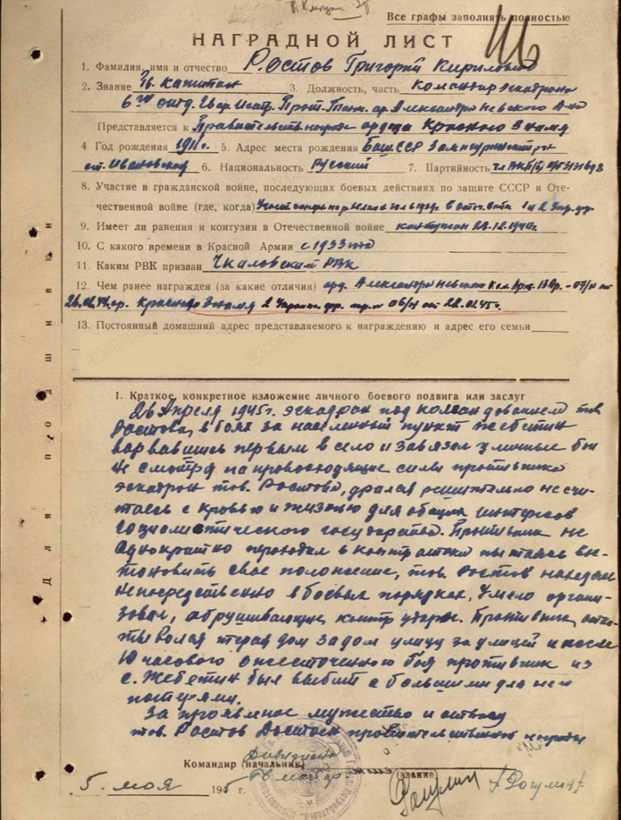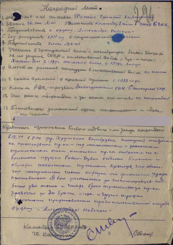 Мой прапрадед был удостоен правительственной награды – орденом Александра Невского за следующие боевые действия: 05.02.1944 года в районе д. Хрушвица Домбрувка, наступая эскадроном на превосходящего противника, под минометным и пулеметным огнем атаковал противника и отбросил его. В бою было уничтожено до 100 гитлеровцев, подбито два танка и четыре бронетранспортера противника, захвачено до 30 бричек обоза и другие трофеи. 20.10.1944 гвардии капитан Ростов при наступлении на г. Дебрецел организовал бой эскадрона, сломив сильное огневое сопротивление противника, решительными действиями, штурмом эскадрона первым ворвался в город Дебрецел, навязав уличные бои противнику, разбив противника, овладел северо-западной Т.Д. станцией Дебрецел, захватил у противника 2 тел. эшелона.