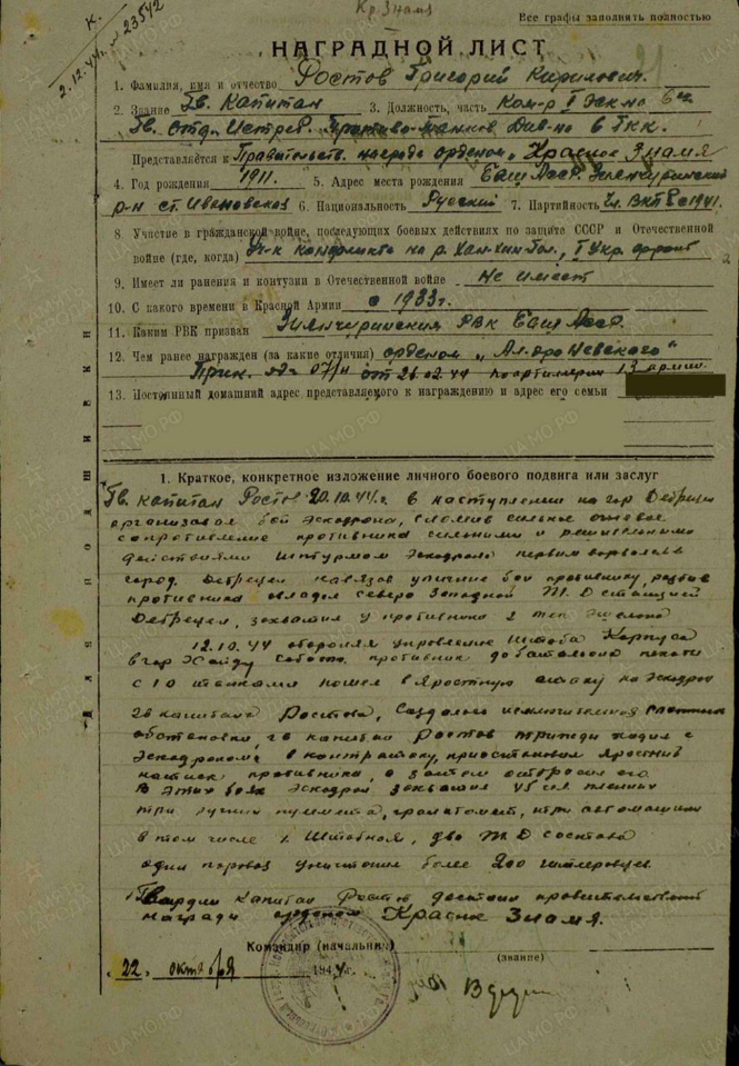 12.10.1944 года, обороняя управление штаба корпуса в г. Хайду Собота, противник добровольно до батальона пехоты с 10 танками пошел в яростную атаку на эскадрон гвардии капитана Ростова, создалась исключительная обстановка, гвардии капитан Ростов трижды ходил с эскадроном в контратаку, приостановил яростный натиск противника, а затем отбросил его. В этих боях эскадрон захватил 45 человек пленных, три ручных пулемета, гранатомет, три автомашины, в том числе 1 штабную, два Т.Д. состава, один паровоз, уничтожил более 200 гитлеровцев. За вышеуказанный подвиг Ростов Г.К. был представлен к награде: орден Красного Знамени.