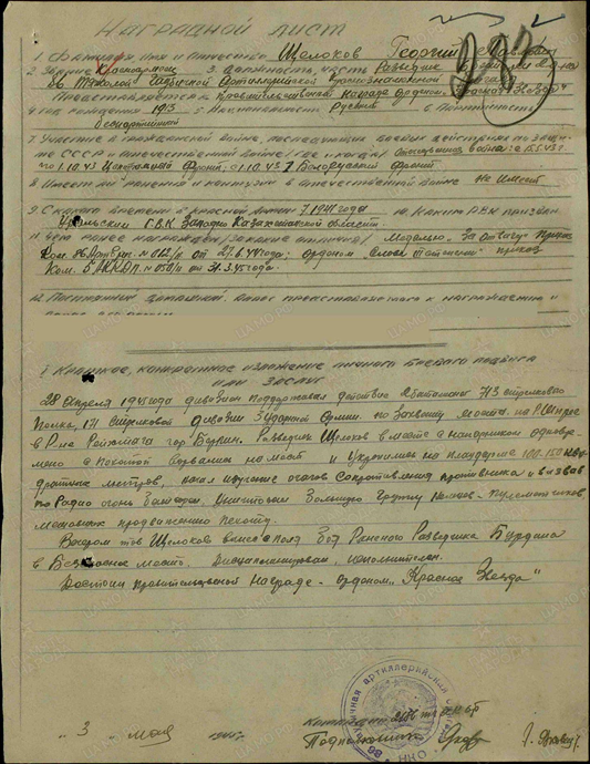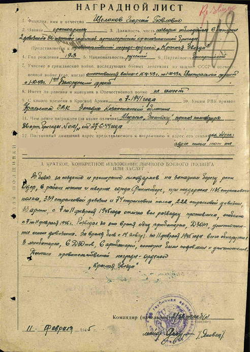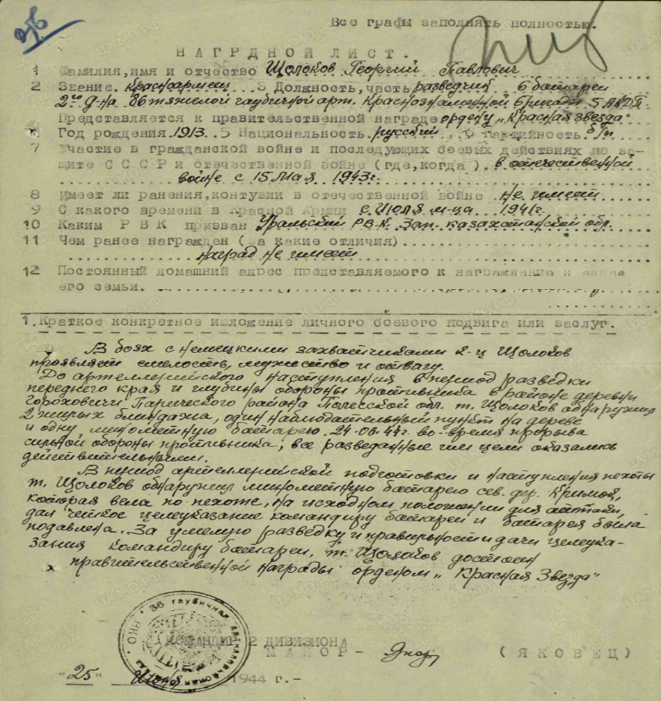 «В боях с немецкими захватчиками 2-й Щелоков проявляет смелость, мужество и отвагу. До артиллерийского наступления в период разведки переднего края и глубины обороны противника в районе деревни Гороховичи Парического района Полесской обл. т. Щелоков обнаружил 2 жирых блиндажа, один наблюдательный пункт на дереве и одну минометную батарею. 24.06.44 г. во время прорыва сильной обороны противника, все разведанные им цели оказались действительными. В период артиллерийской подготовки и наступления пехоты т. Щелоков обнаружил минометную батарею сев. дер. Кримоя(?), которая вела по пехоте, на исходном положении для атаки,дал четкое целеуказание командиру батареи и батарея была подавлена За умелую разведку и правильности выдачи целеуказания командиру батареи, т. Щелоков достоин правительственной награды орденом «Красной звезды» - Подвиг товарища Щелокова Г.П.