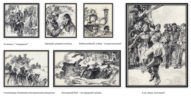 Отгремело эхо войны, но память бывшего фронтовика возвращает его вновь и вновь в это страшное время. Вспоминается блиндаж, однополчане, которых рисовал на коротких привалах, в минуты затишья. Рисунки вкладывались в солдатские письма и отправлялись родным. «Я никогда не смогу, да и не позволю себе забыть своих боевых товарищей. Я хочу всем людям рассказать карандашом и кистью о них, об их подвиге», говорил художник.