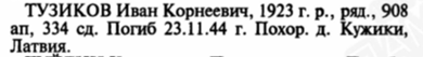Далее я стала изучать расшифровку номеров стрелковых дивизий, передвижения армий и прочее. Спустя время на одном из сайтов наткнулась на фотографию списков 1944 года, в которой был указан Тузиков Иван Корнеевич, уже со званием ефрейтор. Запросив данные из архива, с которого был взят тот документ, я узнала, что Иван Корнеевич был участником Прибалтийской операции, проводимой с 14 сентября по 24 ноября 1944 года, с целью освобождения от немецких войск Эстонии, Латвии и Литвы. В том же документе было написано, что он взят в плен. Дата смерти стоит 23.11.1944. Сделав следующий запрос нашла место его захоронения – общая могила пленённых солдат Латвийская ССР д. Кужики.