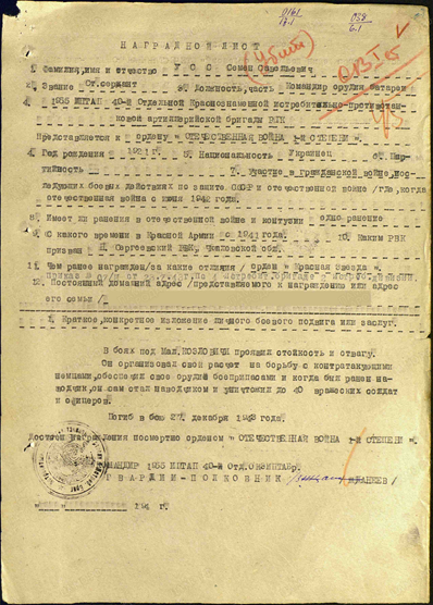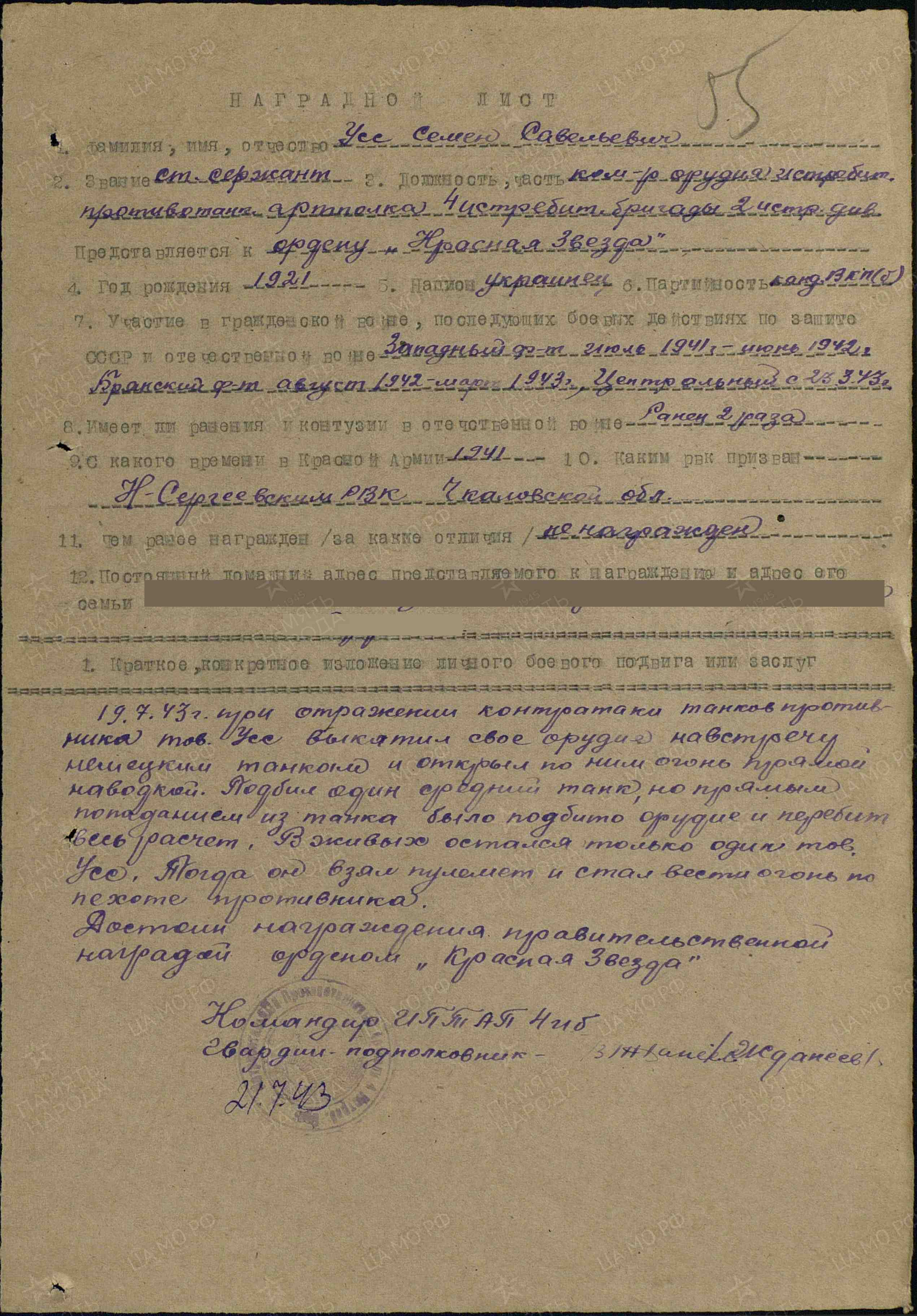 Наградной лист к ордену Красной Звезды, в котором описан подвиг С. С. Усса в июле 1943 г.