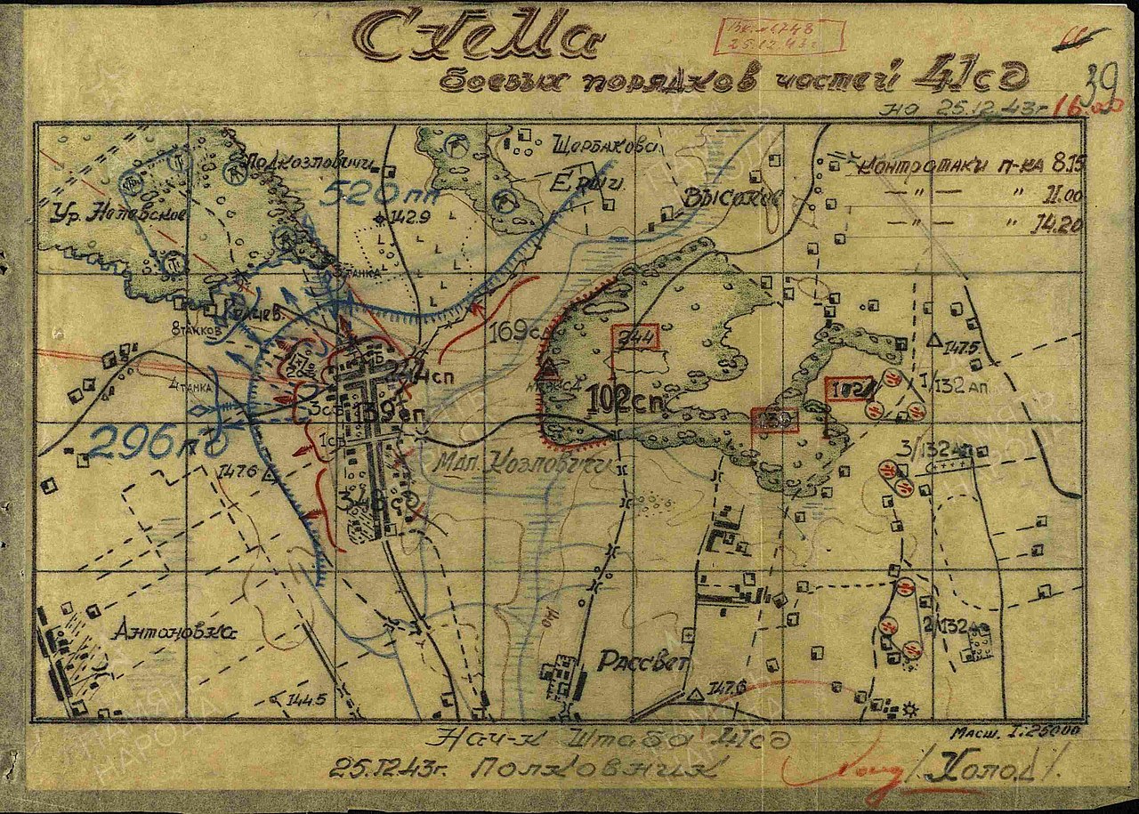 После освобождения Гомеля советские войска продолжили наступление на запад и северо-запад от города, стремясь развить успех и прорваться к стратегически важным коммуникациям противника. В декабре 1943 г. части Белорусского фронта вели бои в направлении городов Речица и Жлобин. Наступая из района Гомеля, советские соединения вышли к рубежам восточнее Жлобина. Одним из узлов сопротивления немцев на пути наступления стала деревня Малые Козловичи (Жлобинский район Гомельской области) – важный опорный пункт на подступах к Жлобину. Здесь развернулись ожесточённые бои. Согласно журналам боевых действий, 9, 10 и 14 декабря 1943 года части 41-й стрелковой и 348-й стрелковой дивизий при поддержке артиллеристов предпринимали атаки на д. Малые Козловичи, однако эти первые штурмы успеха не имели – немецкая оборона оказалась хорошо укреплена и тщательно организована. Лишь 23 декабря 1943 г. после часовой артподготовки, ударов штурмовой авиации Ил-2 и при содействии танков населённый пункт Малые Козловичи был прорван и взят советскими войсками. Взятие деревни дорого далось наступающим: противник оказывал упорное сопротивление, и вскоре после утраты населённого пункта немецкое командование предприняло серию яростных контратак, стремясь отбить Малые Козловичи обратно. Советские части, в том числе расчёты истребительно-противотанковых орудий, спешно заняли оборону на окраинах деревни и отразили многочисленные вражеские контратаки. Эти боевые действия в конце декабря 1943 года были крайне ожесточёнными: войска несли большие потери, но удержали плацдарм. Именно в ходе обороны Малых Козловичей, в одном из боёв 27–28 декабря 1943 года, геройски проявил себя старший сержант С. С. Усс – о подробностях этого эпизода свидетельствуют наградные документы.